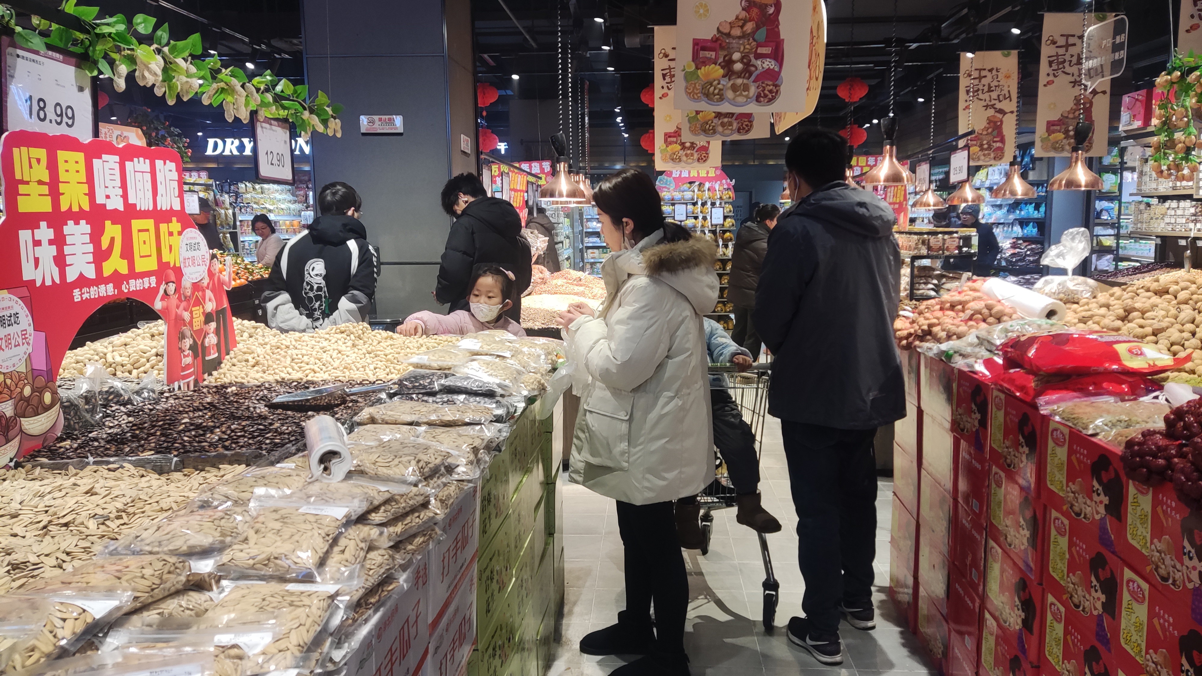 核桃、巴旦木、夏威夷果、碧根果……市民陳女士拎著一大包商品滿載而歸。“吃堅(jiān)果健康又養(yǎng)生,家里人都喜歡吃,過(guò)年期間一家人邊聊天邊吃堅(jiān)果,滿滿年味?!标惻空f(shuō),組合裝小袋堅(jiān)果比較劃算,里面有剝好的杏仁、核桃、腰果等,價(jià)格不貴,方便實(shí)惠。