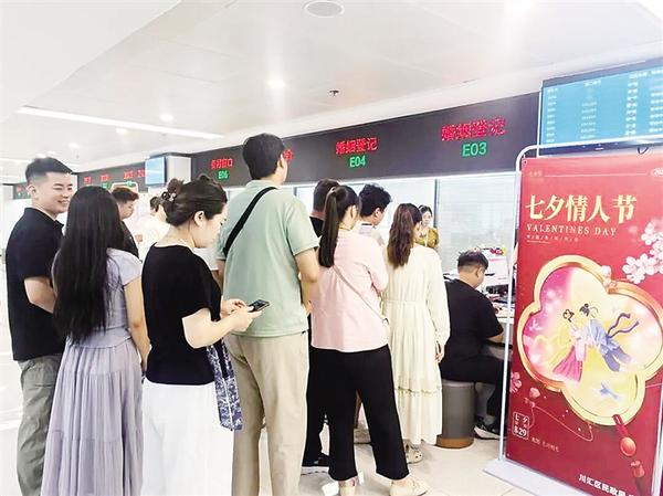 當日9時許,川匯區(qū)民政局婚姻登記處暖意融融,愛意滿滿。一對對新人手挽著手,滿懷期待地等待辦理結婚登記,眼中滿是對未來的憧憬。“七夕節(jié)是專屬于我們中國人的‘情人節(jié)’?!眲倓傤I到結婚證的市民賈云云幸福地表示,“我們特意選擇七夕節(jié)來登記,就是希望我們的感情能像牛郎織女一樣堅定而永恒?!?/p>