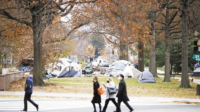 12月8日,在美國(guó)華盛頓,行人經(jīng)過(guò)無(wú)家可歸者居住的帳篷?!?a href="http://m.fanwenbi.com/content/2021-12/11/content_962080.html" target="_blank" >[詳細(xì)]