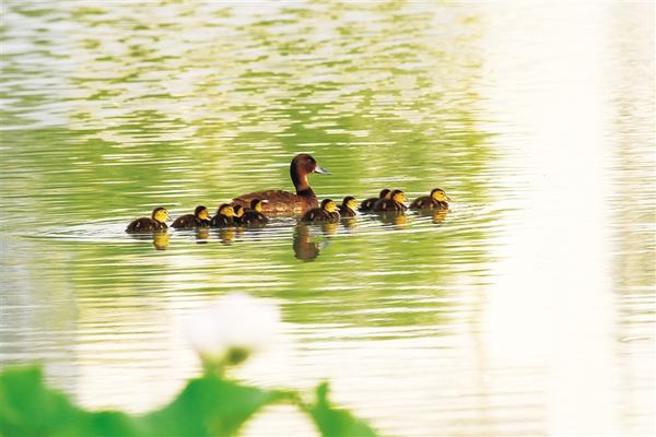6月24日,世界極度瀕危物種、國家一級保護野生動物青頭潛鴨現(xiàn)身淮陽龍湖。當(dāng)日,一只青頭潛鴨帶著10只可愛的“鴨寶寶”在湖中緩緩游弋。有關(guān)方面人士告訴記者,種種跡象可以證明:青頭潛鴨已在淮陽龍湖國家濕地公園安家落戶、繁衍生息。