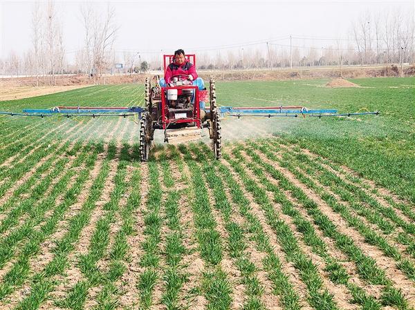 眼下正是春季田間管理的關(guān)鍵期。2月25日,在位于鄲城縣的周口市農(nóng)科院科研基地麥田里,工作人員正駕駛農(nóng)業(yè)機械噴灑除草劑。