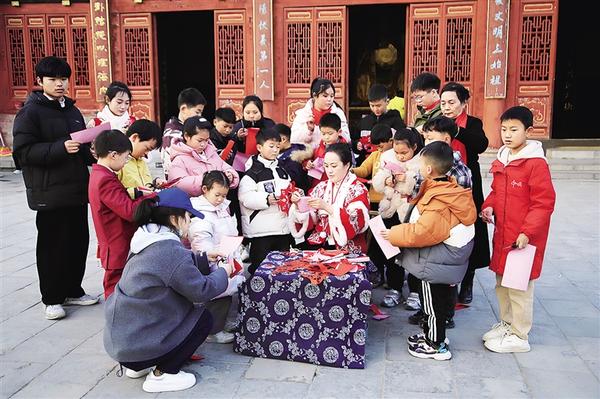 近日,在淮陽太昊陵統(tǒng)天殿前,非遺剪紙傳承人張玉林身著傳統(tǒng)服裝,帶領(lǐng)孩子們一起剪紙。