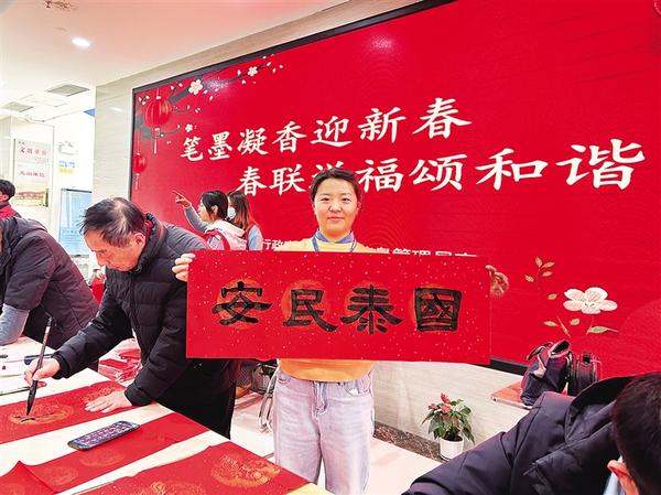 1月20日,扶溝縣政務(wù)服務(wù)中心一名工作人員展示剛收到的手寫春聯(lián)。連日來,我市數(shù)千余名書法家、書法愛好者為市民寫春聯(lián)、送“福”字,送上美好的祝福。