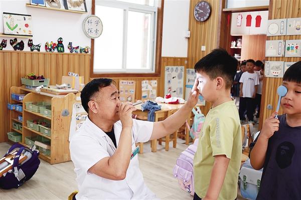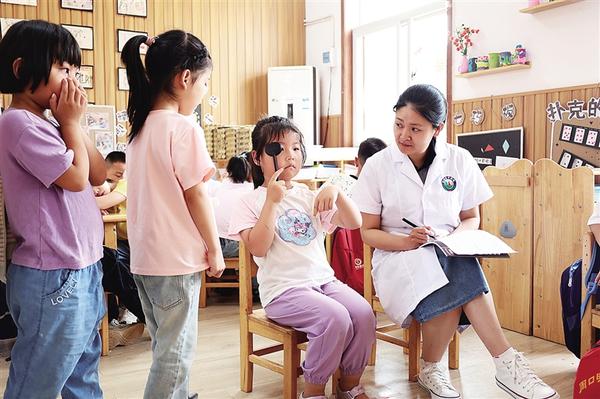 5月19日,扶溝縣中醫(yī)院眼科的醫(yī)護人員在扶溝縣直幼兒園為小朋友檢查視力。近日,為迎接即將到來的第30個全國“愛眼日”,扶溝縣多家幼兒園開展“愛眼護眼從小做起”主題活動,邀請醫(yī)務人員到校講解眼科知識和用眼衛(wèi)生常識,并為小朋友進行視力檢查,引導其養(yǎng)成正確用眼習慣。