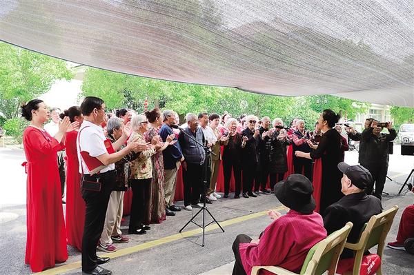 4月27日,周口市退伍軍人合唱團到川匯區(qū)太昊路老年護理院慰問演出。合唱團成員與老人一起演唱《我的祖國》。