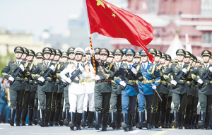 5月9日,在俄羅斯首都莫斯科紅場(chǎng),中國人民解放軍三軍儀仗隊(duì)方陣行進(jìn)在閱兵式上。俄羅斯9日在莫斯科舉行盛大慶典,紀(jì)念衛(wèi)國戰(zhàn)爭(zhēng)勝利70周年。新華社發(fā)