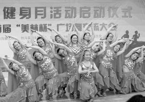 5月10日上午,扶溝縣一女子代表隊(duì)在臺(tái)上表演舞蹈。當(dāng)日,扶溝縣2015年健身月啟動(dòng)儀式暨廣場(chǎng)舞交流大會(huì)拉開帷幕。來自全縣各鄉(xiāng)鎮(zhèn)巾幗代表隊(duì)依次走上舞臺(tái),展現(xiàn)其優(yōu)美的舞姿。在接下來的一個(gè)月里,該縣還將聯(lián)合各類體育協(xié)會(huì)在城區(qū)開展武術(shù)、跆拳道等體育活動(dòng)。盧付昌 申蘭霞 攝