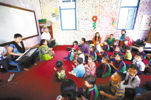 尼泊爾學(xué)校復(fù)課      5月31日,在尼泊爾的巴克塔普爾,復(fù)課的學(xué)生們接受音樂治療。據(jù)尼泊爾當(dāng)?shù)孛襟w報道,尼泊爾教育部已經(jīng)宣布,全國14個地震受災(zāi)縣的學(xué)校將于5月31日復(fù)課。新華社發(fā)