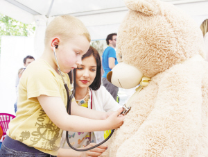 5月30日,在克羅地亞首都薩格勒布,一名男孩在“泰迪熊醫(yī)院”為他的毛絨玩具“聽診”。這一活動的主要目的是消除孩子們對醫(yī)生和醫(yī)院的恐懼。