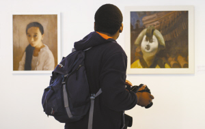“交錯與融合”美術(shù)作品展在南非開幕 6月6日,在南非約翰內(nèi)斯堡舉行的“交錯與融合”美術(shù)作品展上,一名參觀者欣賞華人藝術(shù)家張銳的油畫作品。當(dāng)日,作為“南非中國年”活動的一部分,由華人藝術(shù)家張銳與南非11名畫家共同參與的“交錯與融合”美術(shù)作品展舉行。新華社發(fā)