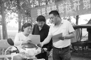 項(xiàng)城市秣陵鎮(zhèn)積極做好夏季秸稈禁燒工作,實(shí)行班子成員包片、機(jī)關(guān)干部包村、村組干部包戶責(zé)任制,全力構(gòu)筑了秸稈禁燒“防火墻”。圖為6月8日該鎮(zhèn)干部在李閣村向過往群眾發(fā)放禁燒宣傳單。(張永久 攝)