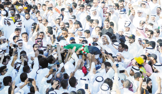 科威特民眾悼念清真寺爆炸事件遇難者   6月27日,民眾在科威特北部蘇萊伊哈特陵園參加活動(dòng),悼念伊瑪目薩迪克清真寺爆炸事件的遇難者??仆?cái)?shù)千名民眾27日在科北部蘇萊伊哈特陵園悼念伊瑪目薩迪克清真寺爆炸事件的遇難者。
