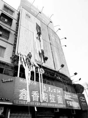 4月9日上午,在周口市區(qū)七一路與大慶路交叉口,兩名工人忙著整修廣告牌,他們“攀附”在墻上的身影,如同電影里的“蜘蛛俠”,讓過(guò)往市民無(wú)不敬畏勞動(dòng)者的辛勞與偉大。晚報(bào)記者  張志新  攝